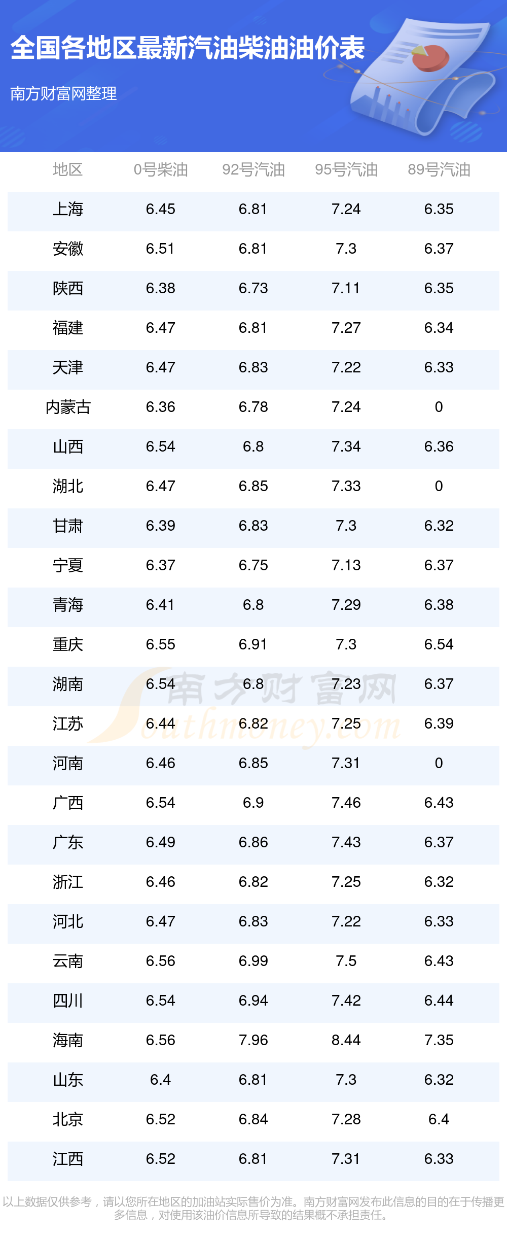 油价数据仅供参考,请以您所在地区的加油站报价为准。南方财富网发布此信息的目的是传播更多详细的信息,对使用该油价信息所导致的结果概不承担任何责任。